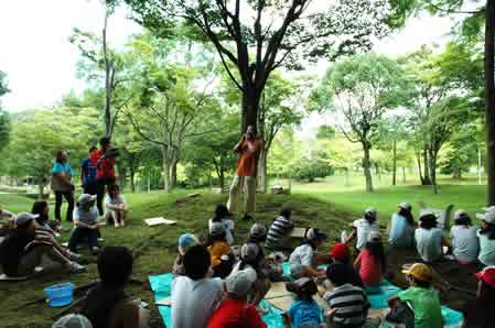 いくつか用意した見本の土笛を参考に皆は銘々の大きさ、そしてユニークな形の土の球体を一生懸命に作り始めた。紐で縄文の模様をつけたり、模様を書き込んだり、装飾を加えたり、それぞれ個性豊かな土笛が出来上がり、子供たちは吹き始めた。 |