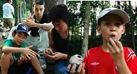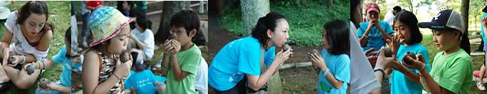 その後、今まで美しい音色を発していた球形の楽器を自分たちでこれから作るのだと知り、みんなの期待は一気に膨らんだ。そして宇々地氏が土笛の作り方を説明しながら、作りかけの笛をいきなり吹くと美しい音色を奏でた。子供たちは、粘土のままでも音が出るその事実に本当に仰天したらしく、一斉に歓声を上げた。宇々地氏は子供たちに粘土を配り、一人一人に作り方を丁寧に教え始めた。なぜかスタッフや先生たち、アメリカ人講師たちまでもいつの間にか、夢中になって土笛作りに参加していた。