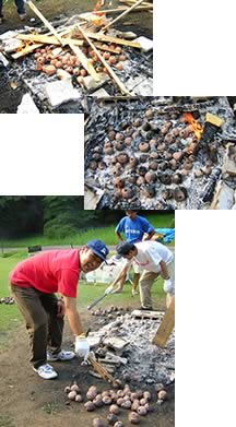 焼き色をつけるためにもう一度火の中に入れるということで、キャンプファイヤーと演奏のリハーサルを兼ねて、火を焚き、高校生キャンパーがその中に素焼きの土笛を丁寧に一つずつ置いてゆく。すると、土笛は火によってまた新たな命が吹き込まれ、味わいがある表情になっていった。とても美しい光景だった。この日はかなり気温が高く、火の周りでの作業はかなり厳しく、皆汗ビッショリになっていた。土笛は、1時間弱で火から取り出され、しばらくそこで熱を冷ます。