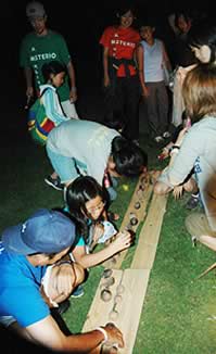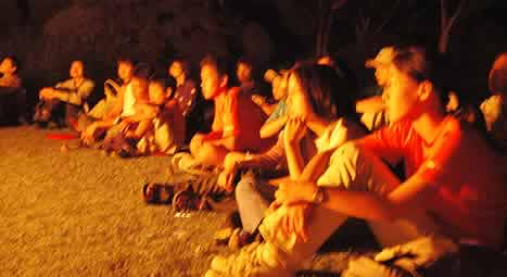 夕食が終わり、辺りが闇に包まれ始めた頃、子供たちは森の中をキャンプ場に向った。 |