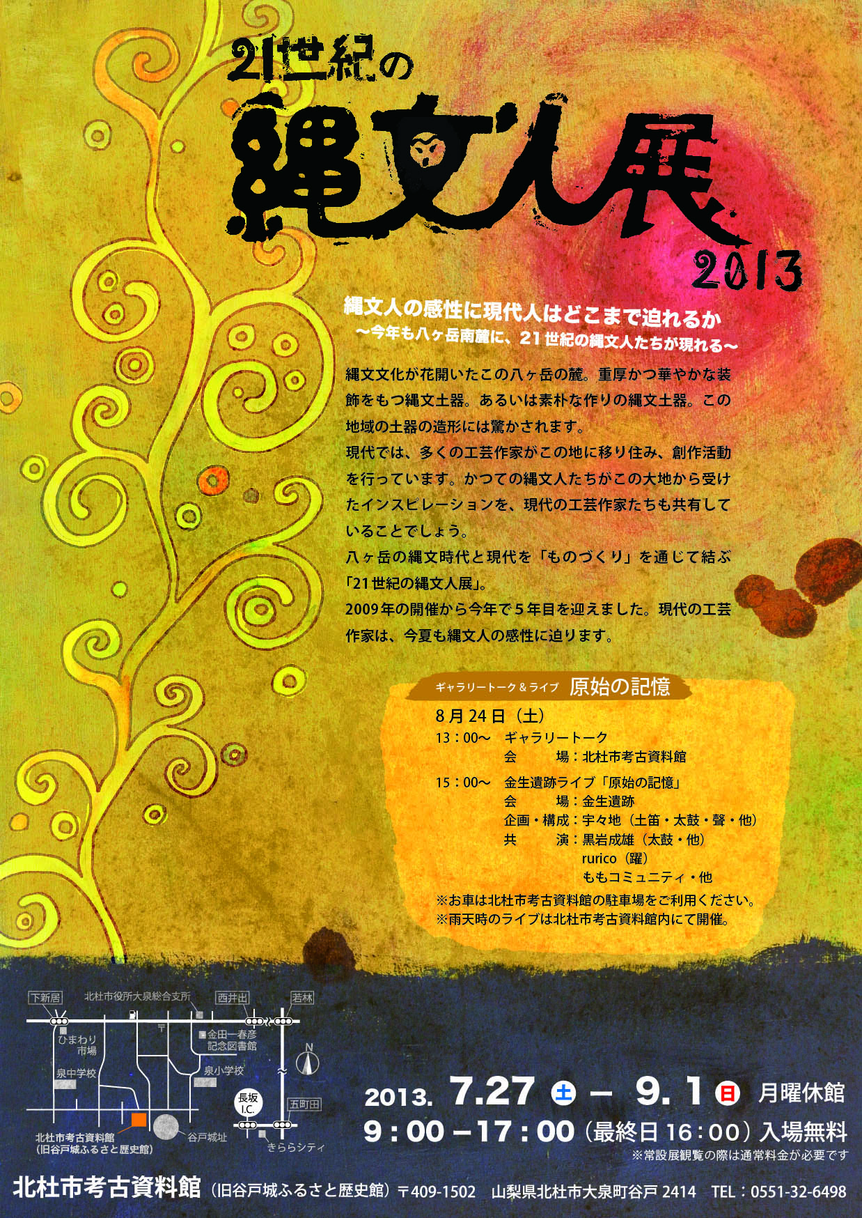 21世紀の縄文人展〜金生遺跡ライブ〜 「原始の記憶」 開 演:15:00(16:00終演予定) 会 場:金生遺跡 http://www.city.hokuto.yamanashi.jp/genre/detail/1737/ 入場無料 ※雨天時は北杜市考古資料館内にて開催 [出 演] 宇々地(企画構成・土笛・太鼓・聲・他) 谷山明人(太鼓) rurico(躍) 山岸利安(ディジュリドゥ・ダンス) 栗谷真吾(ディジュリドゥ) ももコミュニティ 他ゲストを予定 ※太鼓の黒岩さんは都合により出演出来なくなりました事をお詫び致します。