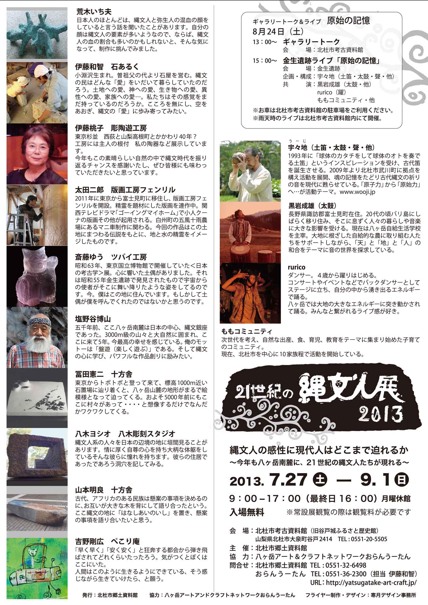 21世紀の縄文人展 縄文コンサート 「真夏の縄文 夢語り」 開 演:15:00 (終演16:00) 会 場:北杜市考古資料館 http://hokuto-kyodo.jp/koko 入場無料 [出 演] 宇々地(土笛・太鼓・聲・他) 塩澤大地(土器太鼓・他) JYOMON土器ドラムバンド森の精霊(土器太鼓) ☆7月28日〜8月26日会場に土笛を展示しています。