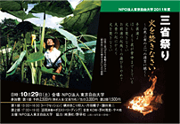 「三省祭り2011」 〜火を焚きなさい〜 山尾三省の三つの遺言に聴く 第1部:13:00〜16:30 / 第2部:17:30〜19:00 会 場:東京自由大学 http://homepage2.nifty.com/jiyudaigaku/ 第1部 トークセッション 13:00〜16:30 パネリスト:槇田きこり但人(富士山御師)、丹羽順子(サステナビリティー活動家) コメンテーター:長屋のり子(詩人)、中野民夫(ワークショップ企画プロデューサー) 司 会:鎌田東二(京都大学こころの未来研究センター教授) 第2部 即興演奏+ポエトリーリーディング 17:30〜19:00 音 楽:KOW+野村雅美+宇々地 参加者がそれぞれ山尾三省氏の詩を自由に朗読していただきます。 参加費:第1部 予約:2,500円/当日:3,000円(定員70名) 第2部 1500円(定員30名)なるべく早めにご予約ください。 予 約:TEL/FAX:03-3253-9870 jiyudaigaku@nifty.com 協力:地湧社、野草社 【PDFダウンロード】 【PDFダウンロード】