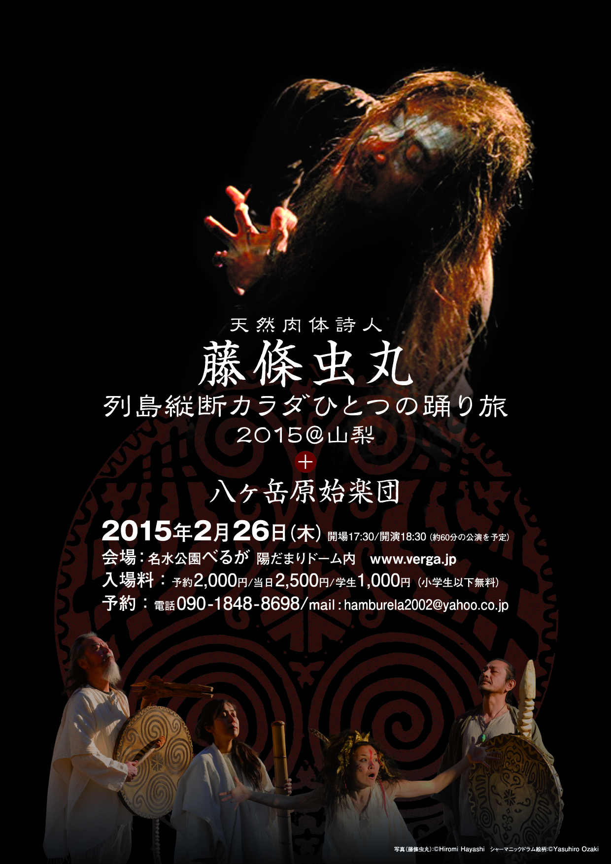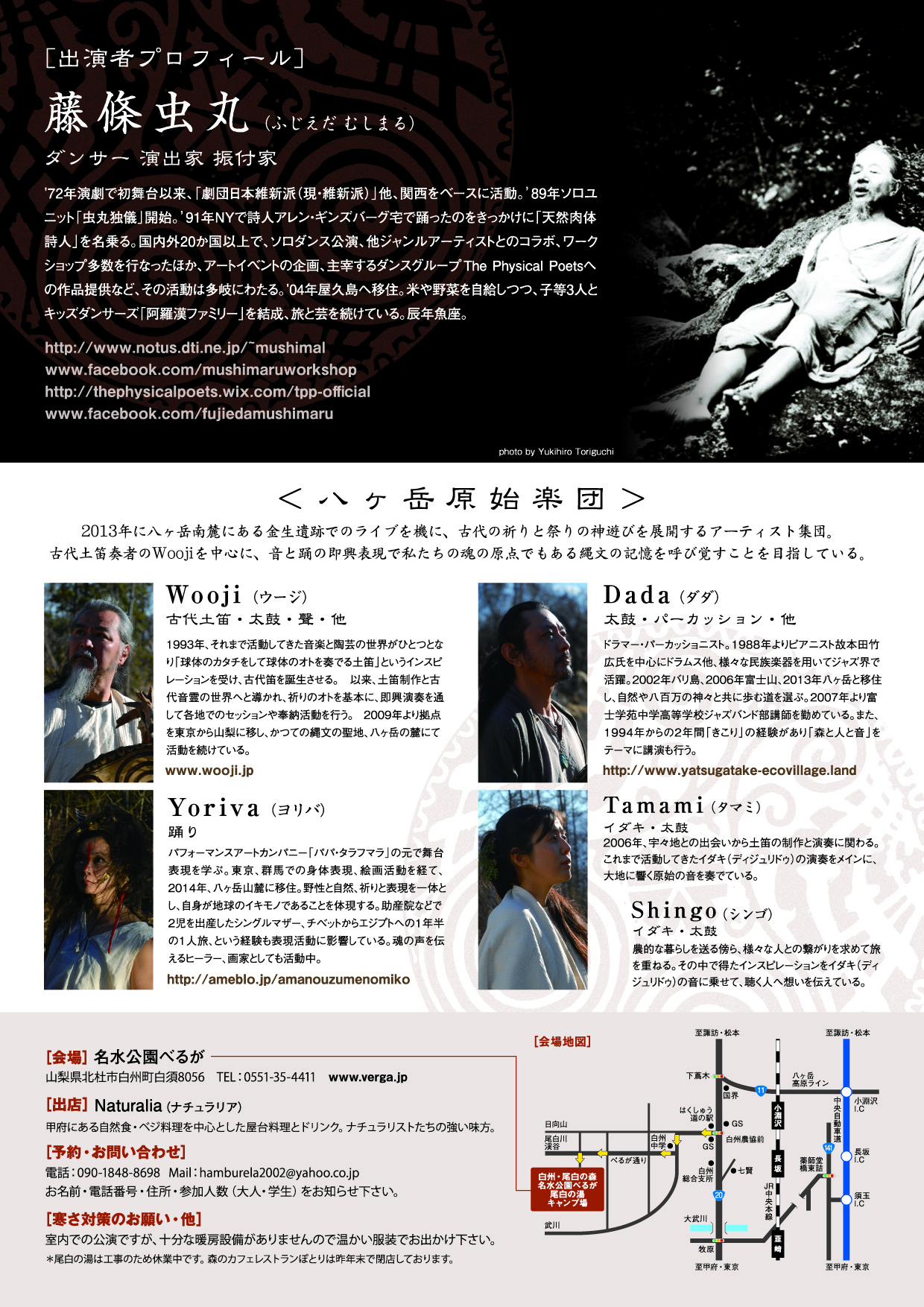 天然肉体詩人 藤條 虫丸列島縦断カラダひとつの踊り旅 2015@山梨+八ヶ岳原始楽団 日 程:17:30〜 開場 18:30〜 開演(約60分の公演を予定) 会 場:名水公園 べるが 陽だまりドーム内 www.verga.jp 山梨県北杜市白州町白須8056 入場料:予約2,000円/当日2,500円/学生1,000円(小学生以下無料) 予 約:電話 090-1848-8698 / mail : hamburela2002@yahoo.co.jp 出 店:Naturalia(ナチュラリア) [出 演] 藤條 虫丸(踊り・演出・振付) 八ヶ岳原始楽団 Wooji(古代土笛・太鼓・聲・他) Dada(太鼓・パーカッション) Yoriva(踊り) Tamami(イダキ・太鼓) Shingo(イダキ・太鼓)